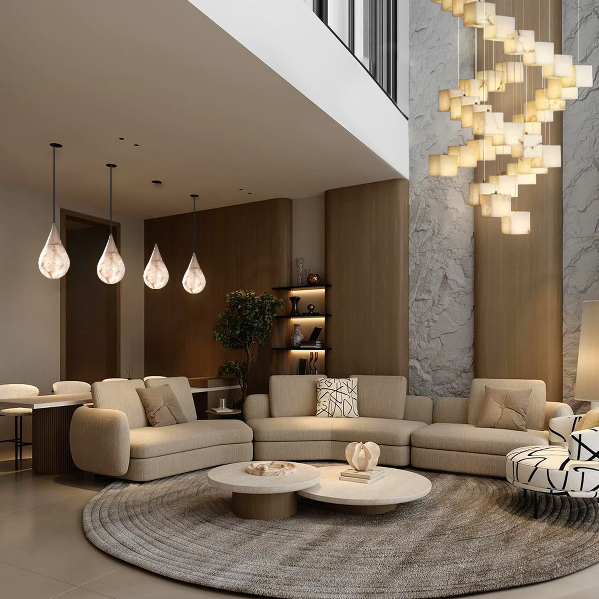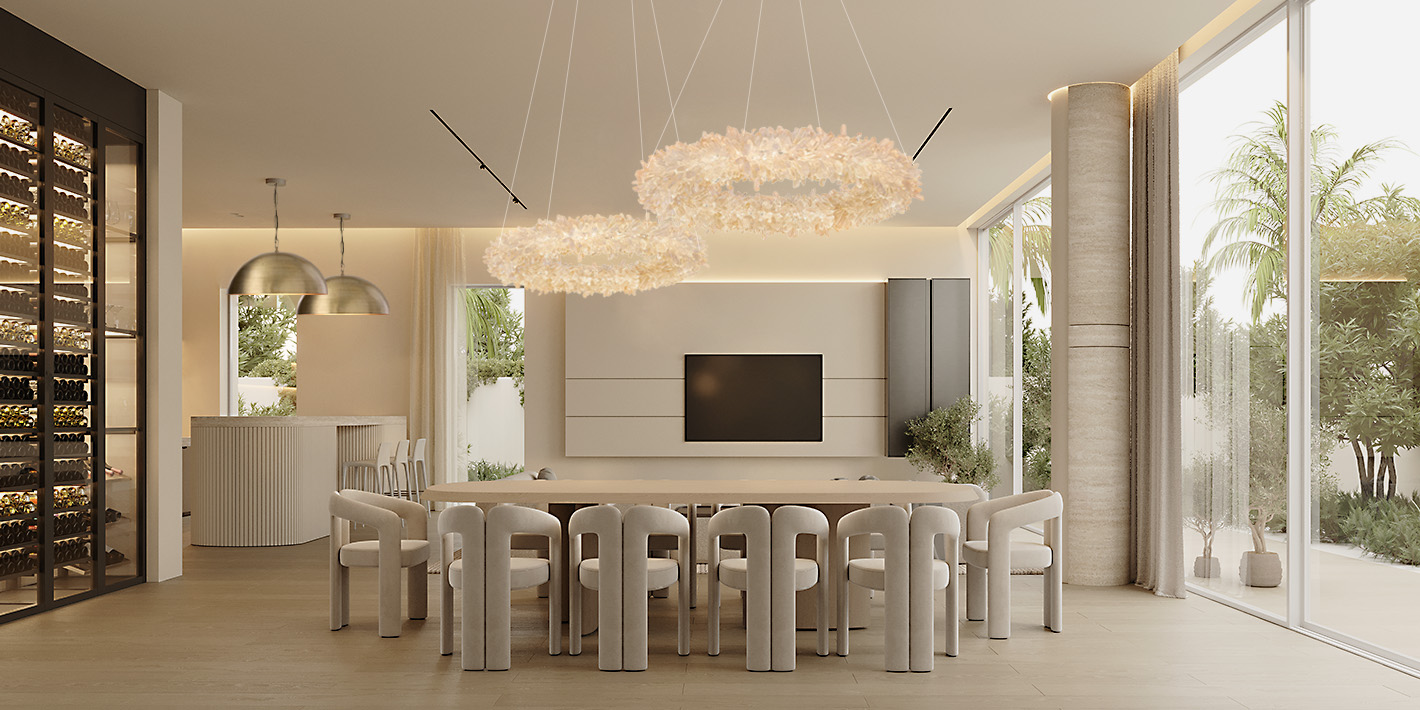 Above the dining table, two quartz chandeliers provide a soft, inviting glow, adding sophistication to your meals.