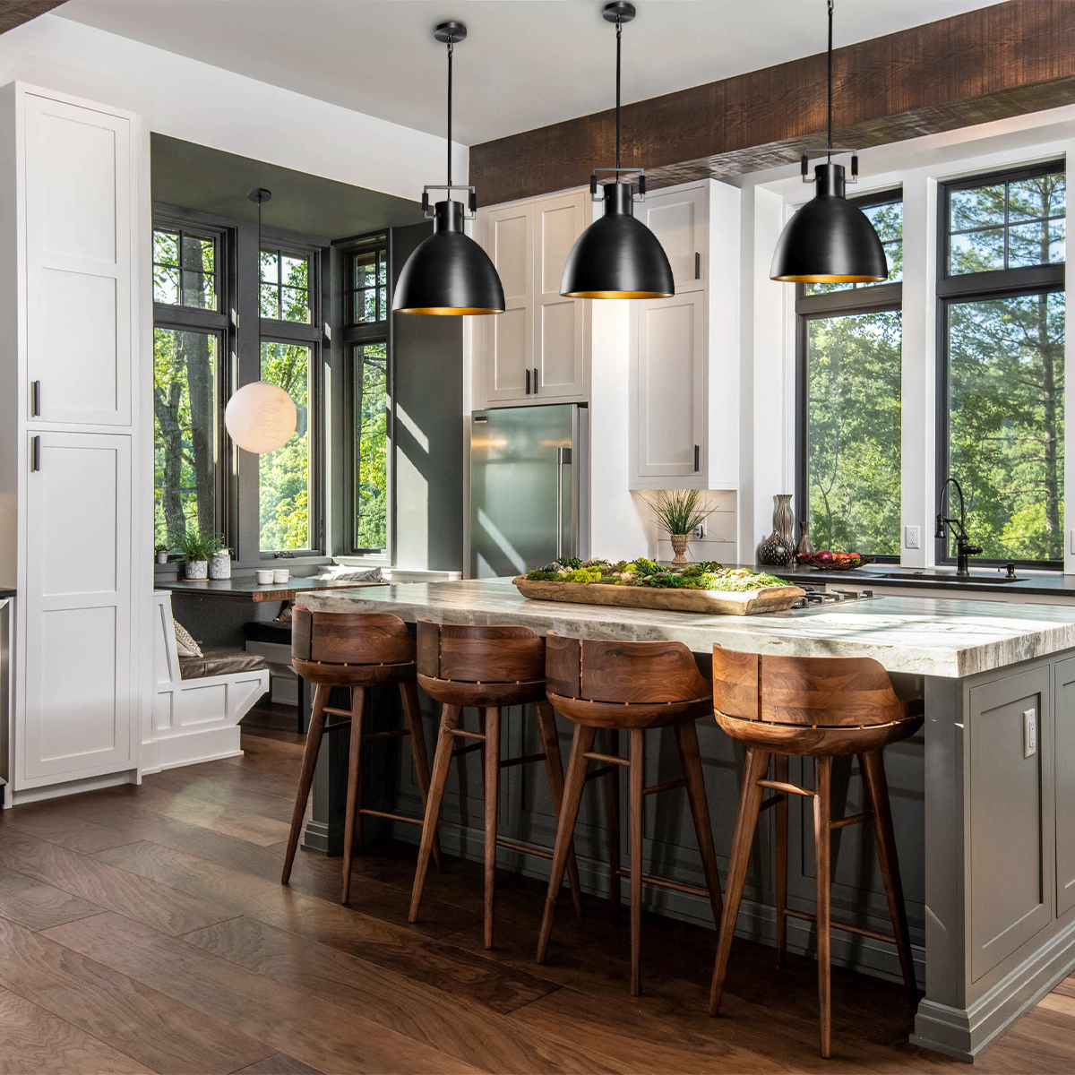 Two metal dome lights over the bar offer sleek, focused lighting for drinks and conversation.