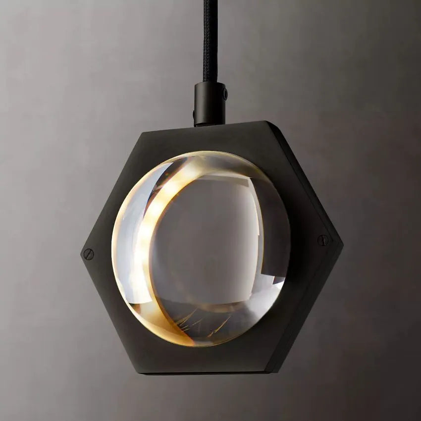 Features hand-blown glass polyhedra on a tiered steel frame, reflecting light beautifully.