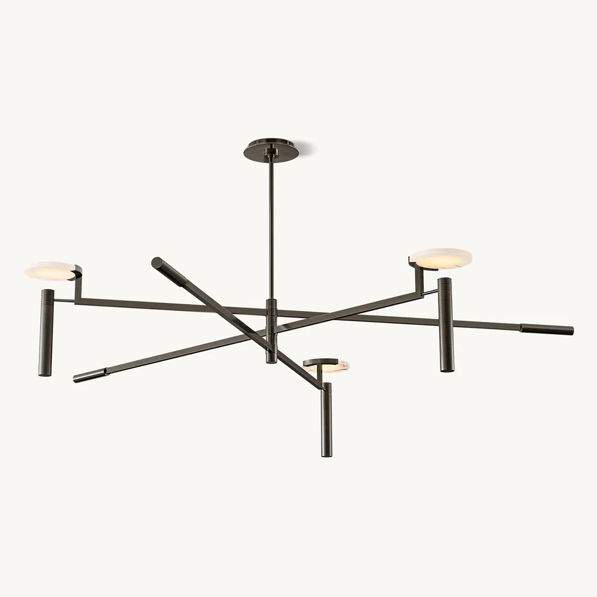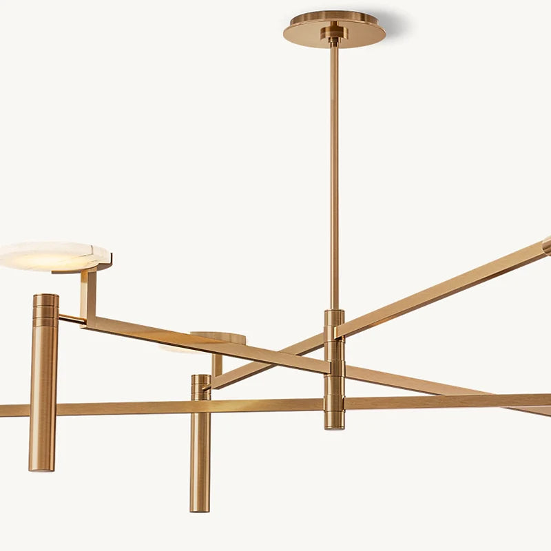 Inspired by mid-century Italian design, rich natural alabaster brings sophistication to the Melange collection. Three slender snowflake discs seem to float above a restrained brass armature. Light passes through the translucent stones, radiating a warm glow.