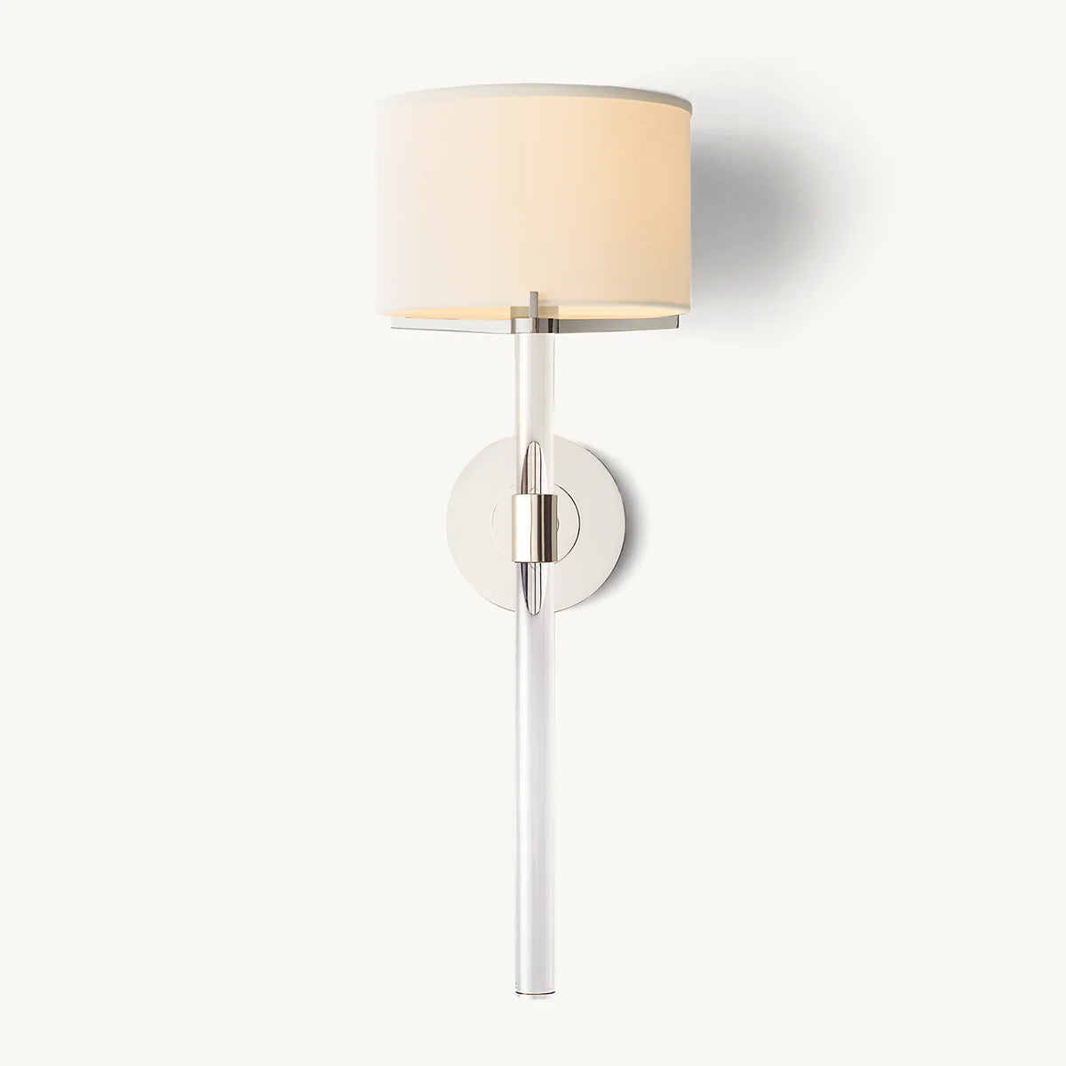 Our Truman collection evokes the clean lines of 1960s minimalism. The juxtaposition of glass and metal conveys purity of line, shape and material. Sleek crystal columns rise from metal bases, with no wires visible in the clear casing. The circular shape echoes the entire collection, but the effect is long and linear.